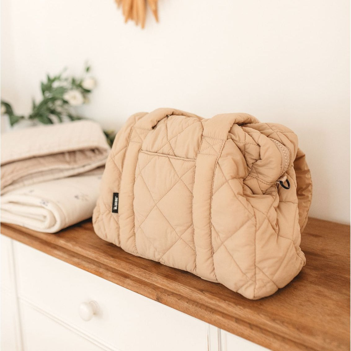 Oversized side bag with quilted stitching. Full of style, spacious, functional and easily hung on all types of strollers.