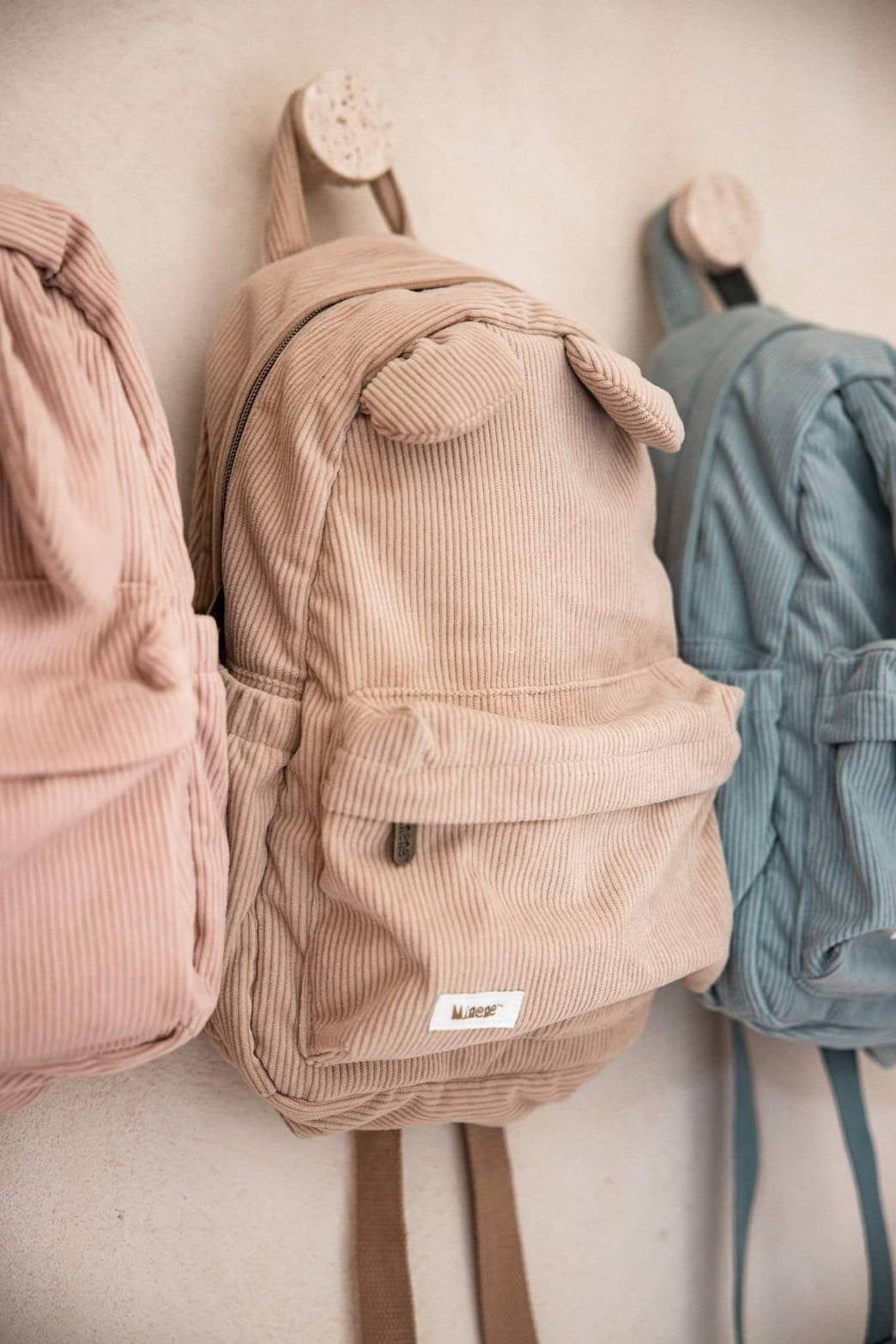 A backpack made of soft and durable corduroy fabric. Has a liquid-repellent lining and a special tag to write the child's name.