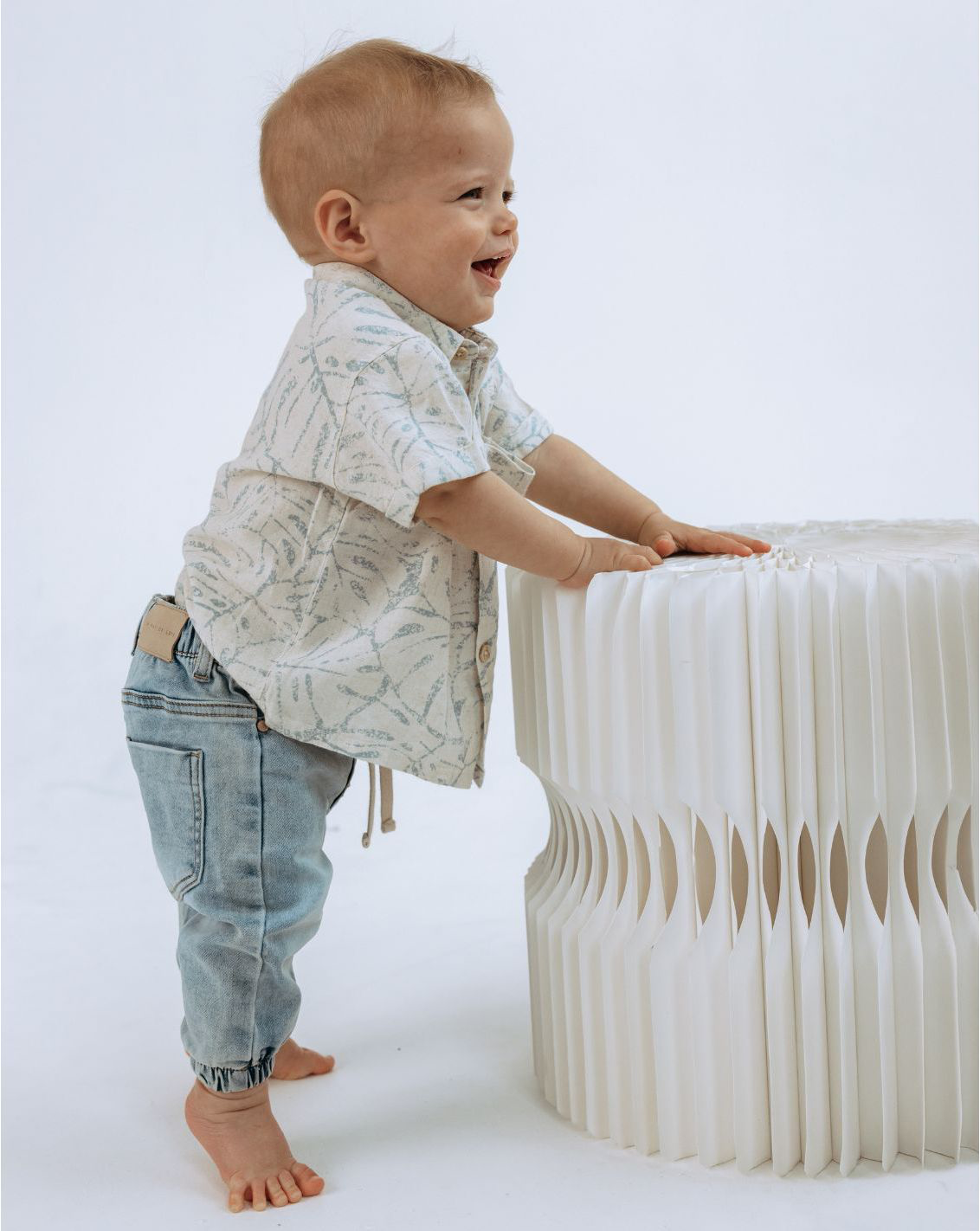 Baby long denim pants with leg contractions. Comes in sizes 0-3 and up to 18-24 months. Fabric composition: washing instructions according to the garment label