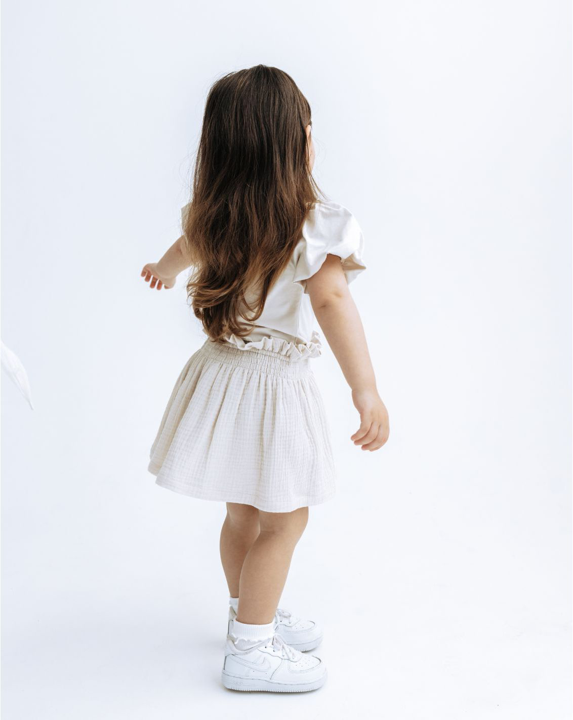 Festive girls' line consists of all the hot trends of natural, delicate and soft colors with embroideries for a festive look. The muslin skirt comes in sizes 2-3 and up to 7-8 years. Washing instructions according to the label.