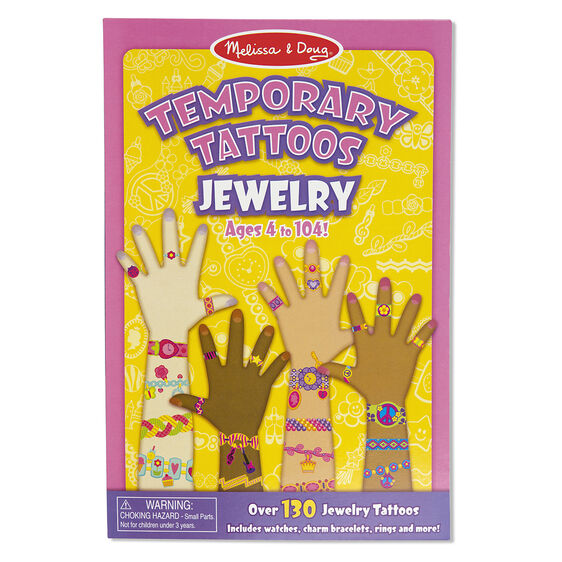 It's the jewelry kids wear right on their skin! Temporary Jewelry Tattoos include bracelets, watches, rings, and charms that press right on with a wet paper towel and last for days. Each pack includes over 130 kid-friendly press-on tattoos in cool jewelry shapes to layer and combine. Press on a charm bracelet then add the charms, or put a ring on every finger and toe-with bright colors and cool designs to mix and match, each pack has countless ways to accessorize! Tattoos come on four perforated sheets, so it's easy for children to see them all at a glance and easy to separate the "jewelry" of their choice. Removes easily with oil or rubbing alcohol.