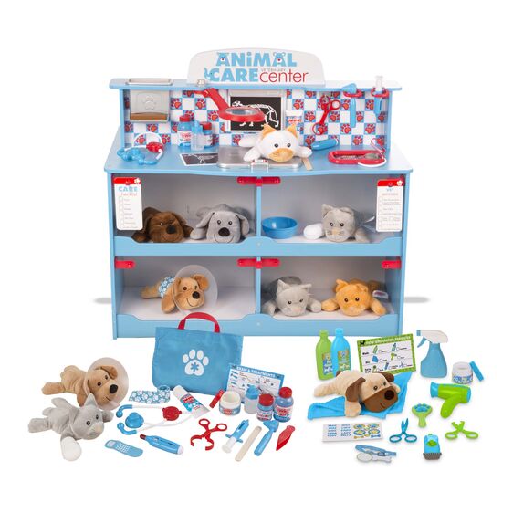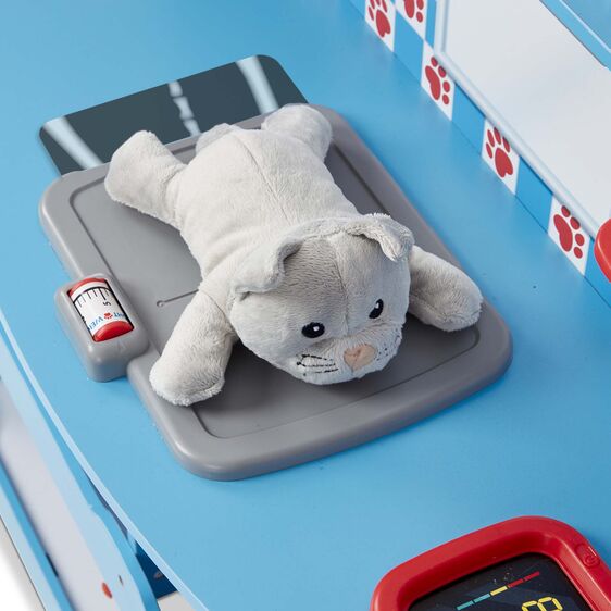 This is the perfect space for caring for furry friends! With a veterinarian side and a groomer side, plush pets can be examined, treated, and pampered for endless hours of imaginative fun. The sturdy wooden play center features an "x-ray" lens with two removable x-rays, pet scale, blood pressure monitor, sink, treat chute, pump bottle dispenser, and lots of storage. There are hooks and holders for lots of accessories. Detailed assembly instructions are included (assembles with just a Phillips head screwdriver, not included). Kids three and older will love having their very own space to nurture and care for their plush pals!