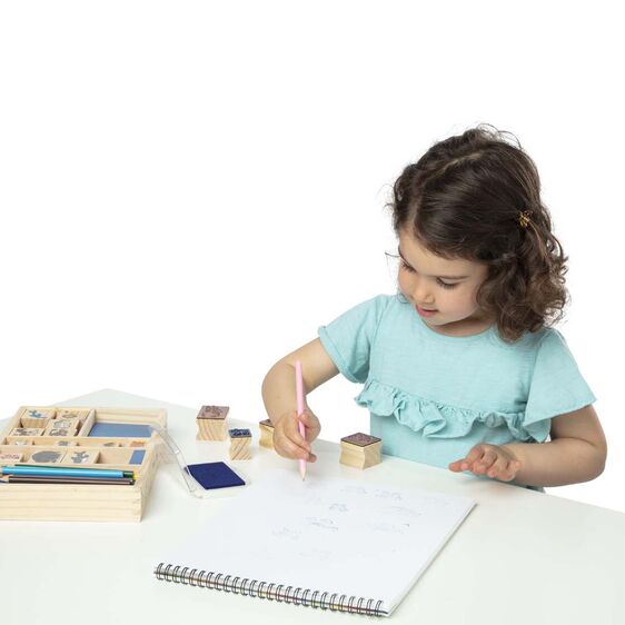 Animal lovers, here's the stamp set for you! Mix and match the detailed stamps with images of wild and domestic animals from land and sea, to create hundreds of beautiful scenes. All the pieces, including 16 stamps, 7 colored pencils and a durable inkpad, store in the sturdy wooden box. Washable, non-toxic kid-friendly ink.