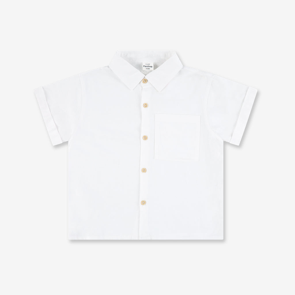 A festive line for boys is designed in loose cuts in natural colored linen and textile fabrics. Short buttoned twill shirt. Comes in sizes 2-3 and up to 7-8 years. Washing instructions according to the label.