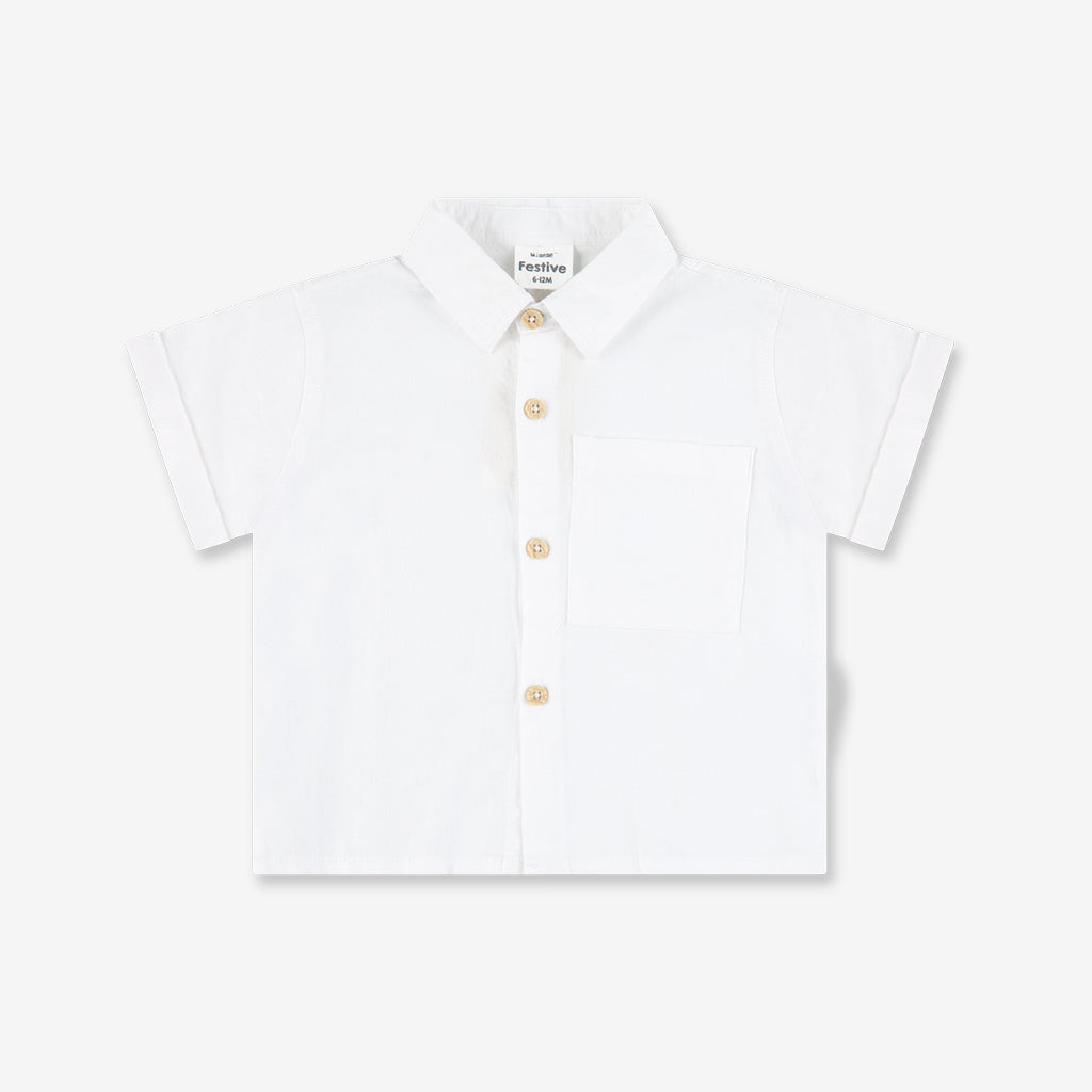 เสื้อเชิ้ตลายทวิลติดกระดุมสั้นสำหรับเด็กชาย ผลิตจากผ้าลินินและสิ่งทอสีธรรมชาติเนื้อนุ่มสบาย เหมาะสำหรับเทศกาลต่างๆ มีขนาดตั้งแต่ 3-6 เดือนถึง 18-24 เดือน คำแนะนำในการซักตามฉลาก