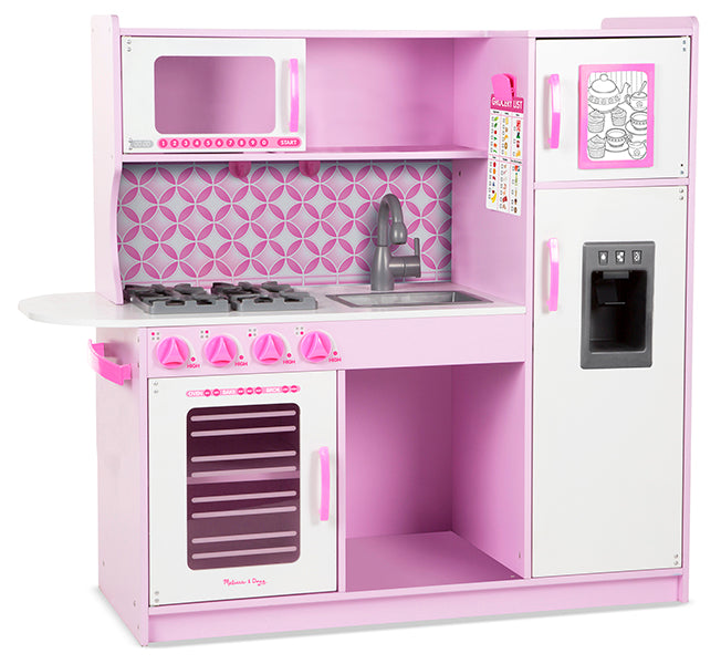Budding young chefs can hone their craft in this beautifully designed, pretty pink modern play kitchen! The easy to assemble chef's kitchen includes a refrigerator/freezer with working ice maker that dispenses two included "ice cubes," an oven and stovetop with dials that turn, microwave with turning plate, sink with moving faucet and handle, grocery check list, movable hooks, and ample shelving and storage. Detailed, illustrated instructions make this kitchen simple to put together. Assembled, it stands approximately 3.5 feet (1 meter) long and more than three feet (0.9 meters) high. Sturdy, top-quality wooden construction means it will stand up to years of creative make-believe meal-making! Accessories sold separately.