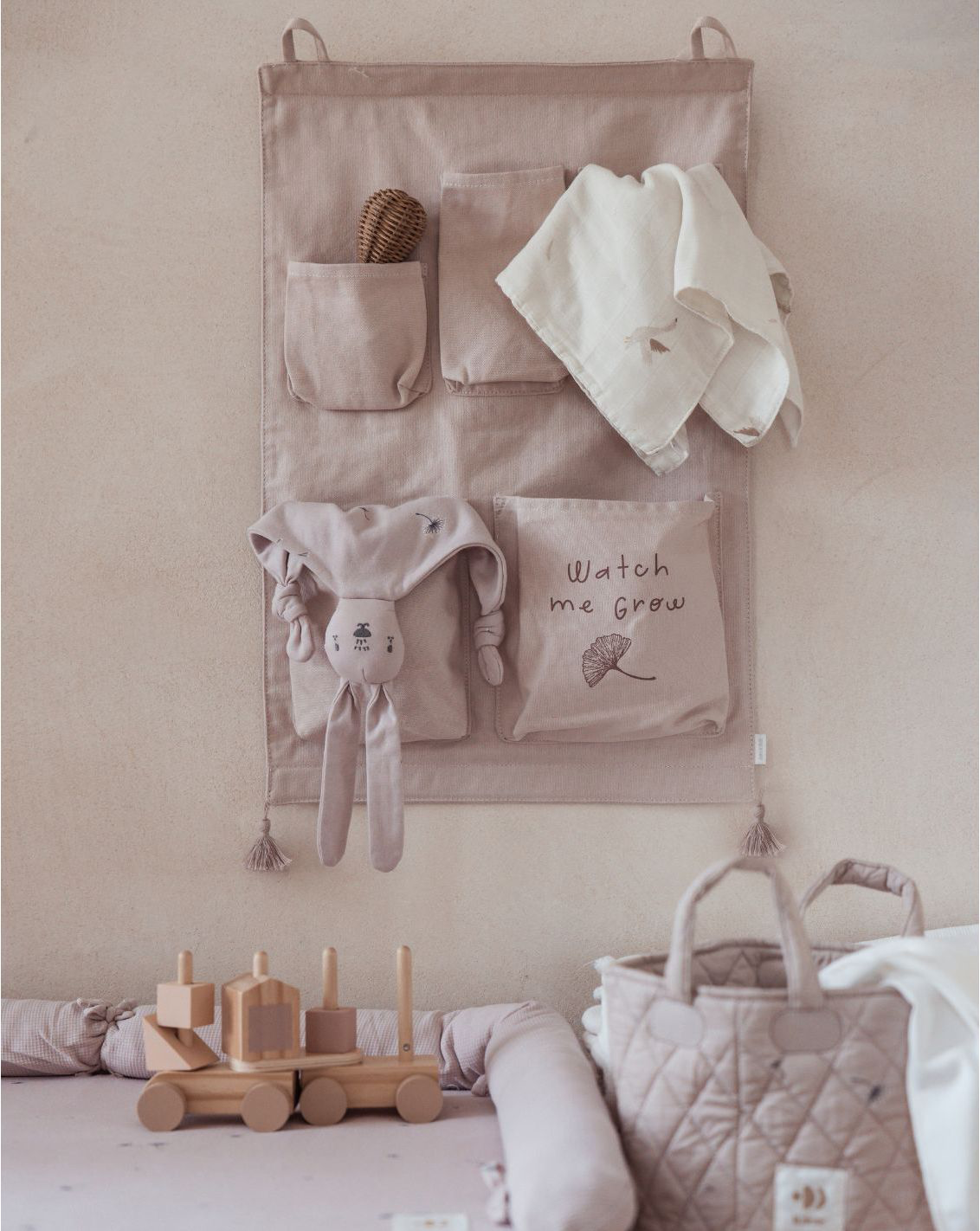 ที่จัดระเบียบติดผนังอเนกประสงค์ออกแบบให้ปลายมีพู่ มีช่องหลากหลายสามารถใช้สำหรับเก็บผ้าอ้อม ผ้าเช็ดทำความสะอาด และอุปกรณ์อื่นๆ สะดวกสบายในการหยิบใช้